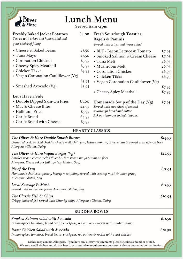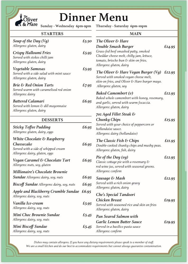 The Oliver and Hare resides at 2 Hockliffe St, Leighton Buzzard, LU7 1HJ. This location is central, making it easily accessible for locals and visitors alike. The restaurant has quickly become known for its friendly service and engaging atmosphere. It re-opened recently under new management, which has revitalized the vibe while maintaining its commitment to quality food and community engagement. The combination of casual dining and private hire options makes it a fantastic choice for both everyday meals and special occasions.
